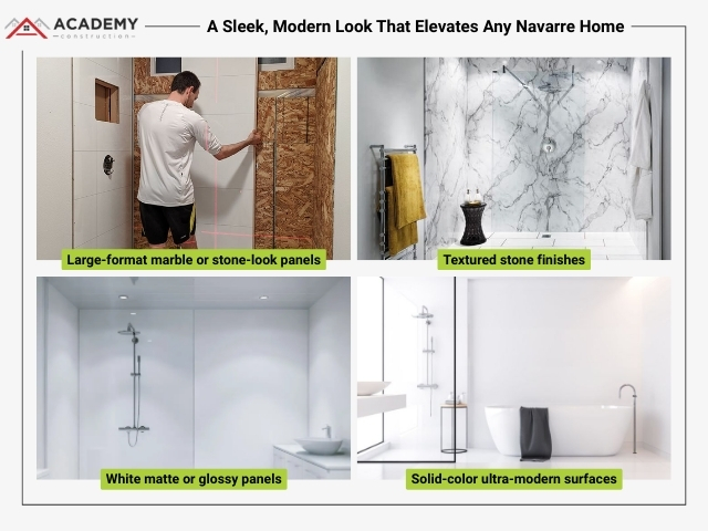 Modern no-grout wall systems are highly versatile, allowing Navarre homeowners to create a custom, high-end look without paying for fully bespoke construction.