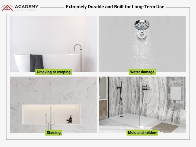 These solid-panel systems whether acrylic, stone-composite, PVC-based, or high-pressure laminate create a fully waterproof, sealed surface that doesn’t absorb moisture and doesn’t require constant scrubbing or annual resealing.