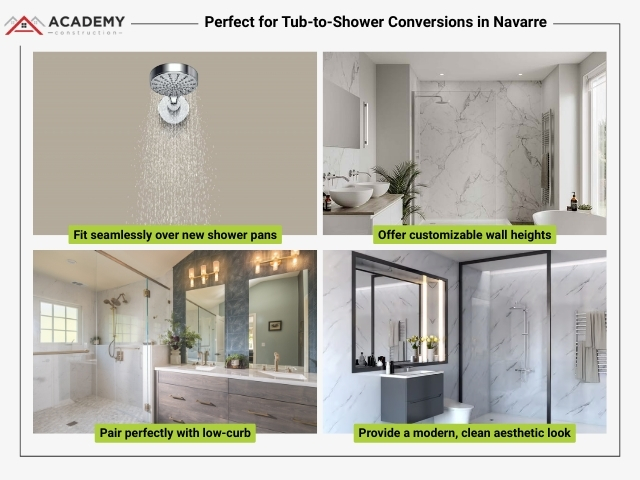 Many Navarre homeowners are upgrading older bathrooms by converting tubs into roomy, walk-in showers. No-grout wall systems are ideal for these remodels because they: