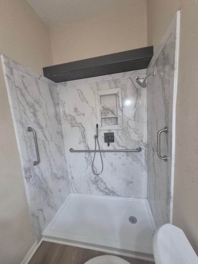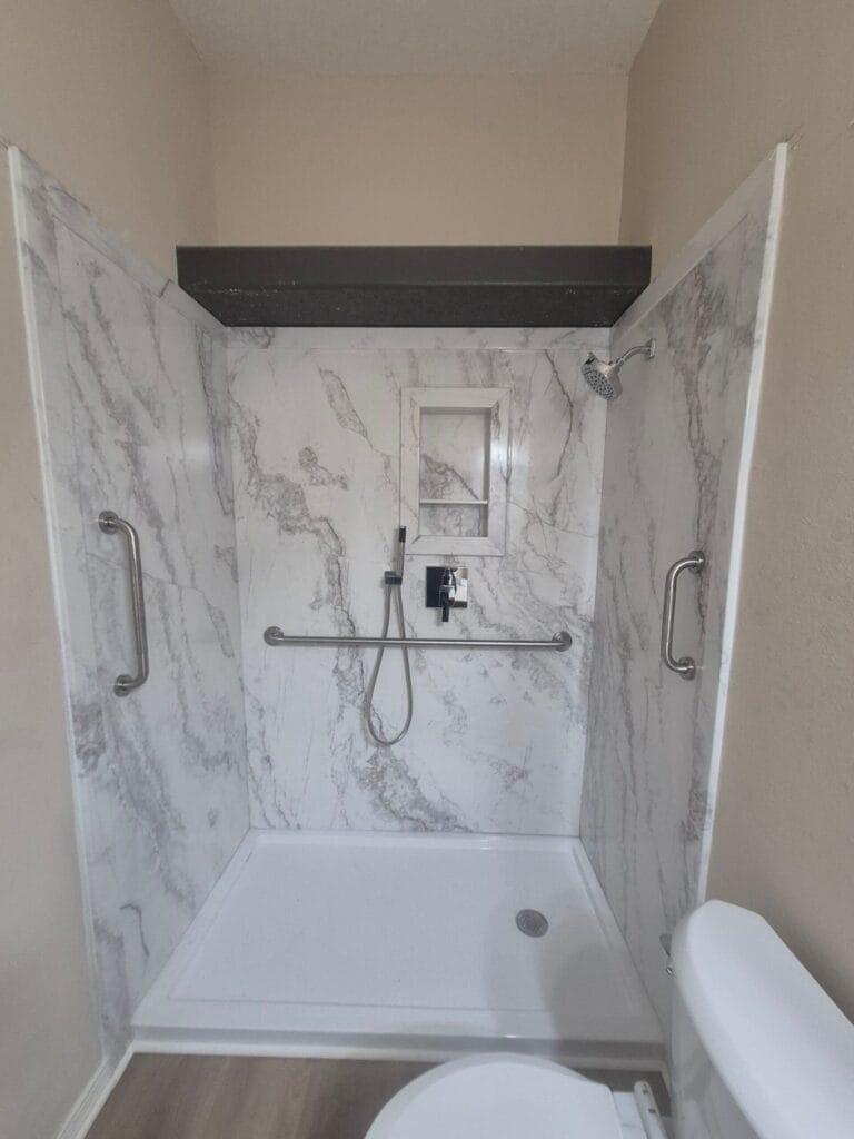 The client got the safe walk in shower that was desired. No tub wall to step over, and plenty of support with grab bars strategically placed. The client’s plan of where to sit to bathe, and having access from that seating place to easily reach the shower controls and the wand came to life because we planned it all out with the client and had them sit in the space and reach to where these things could be and we collaboratively decided exactly where each item would be. The client was very pleased with the finished shower.