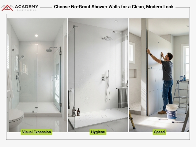 No-grout shower systems (like Nextile or solid-surface panels) are ideal because they install quickly, are waterproof, and have no bulky tile edges or grout lines to visually break up the room.